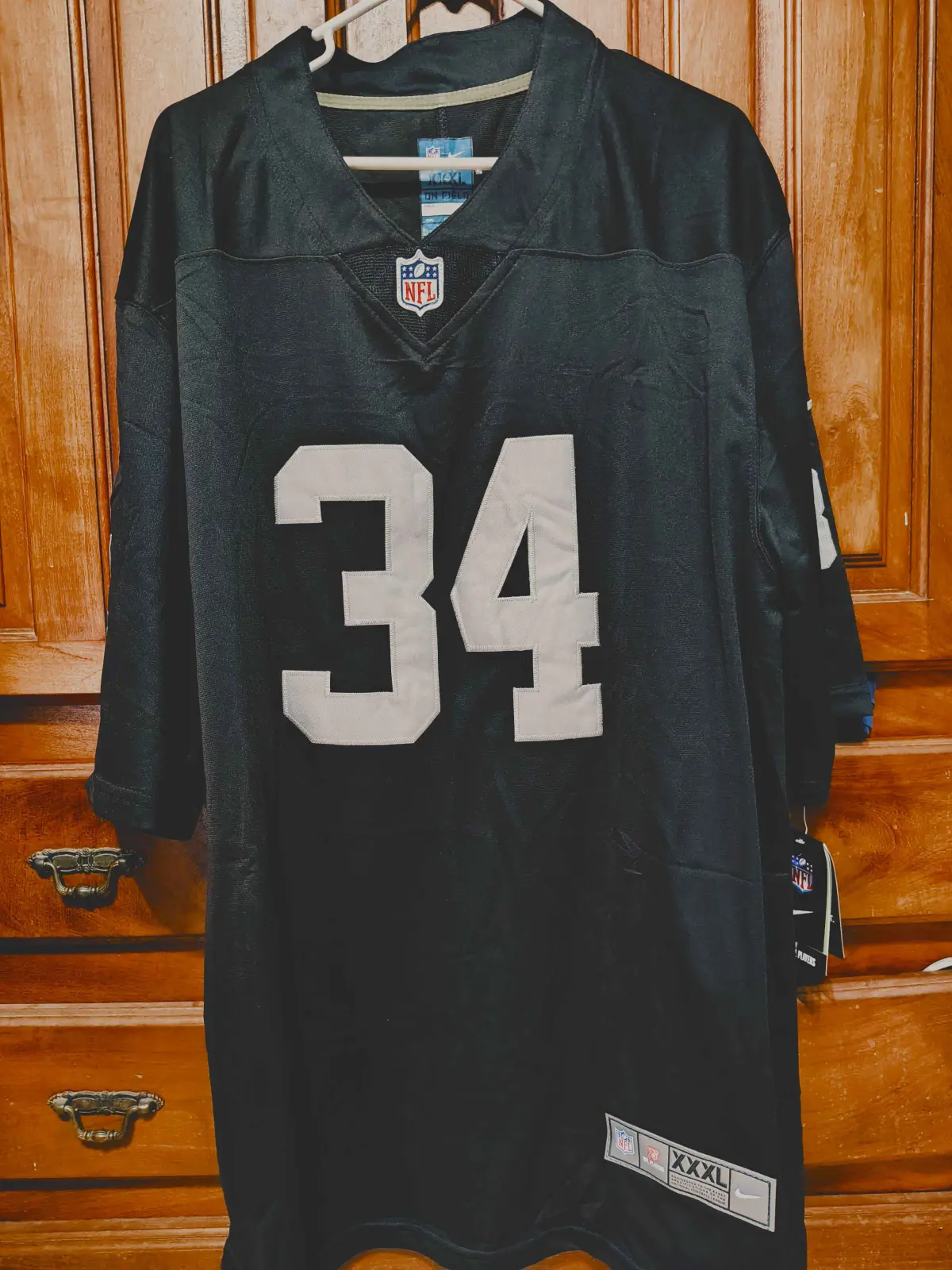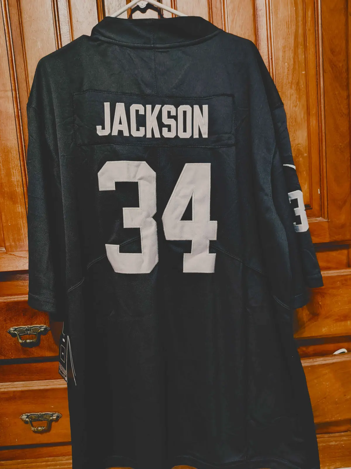 La camiseta de la imagen es una réplica del jersey de los Raiders de la NFL con el número 34, que usó el legendario jugador Bo Jackson. Jackson jugó como corredor para los Raiders de Los Ángeles (entonces Oakland y ahora Las Vegas) desde 1987 hasta 1990