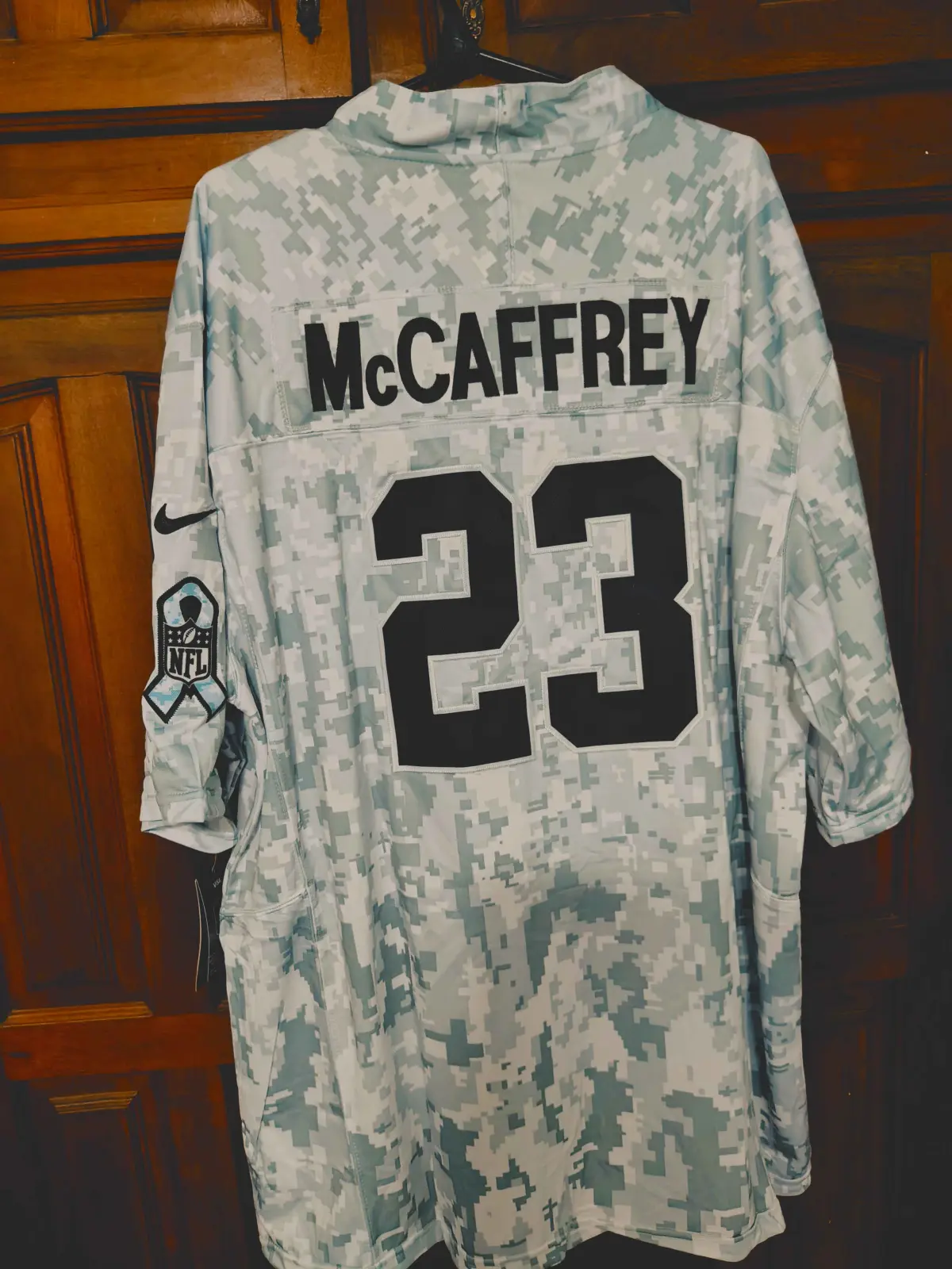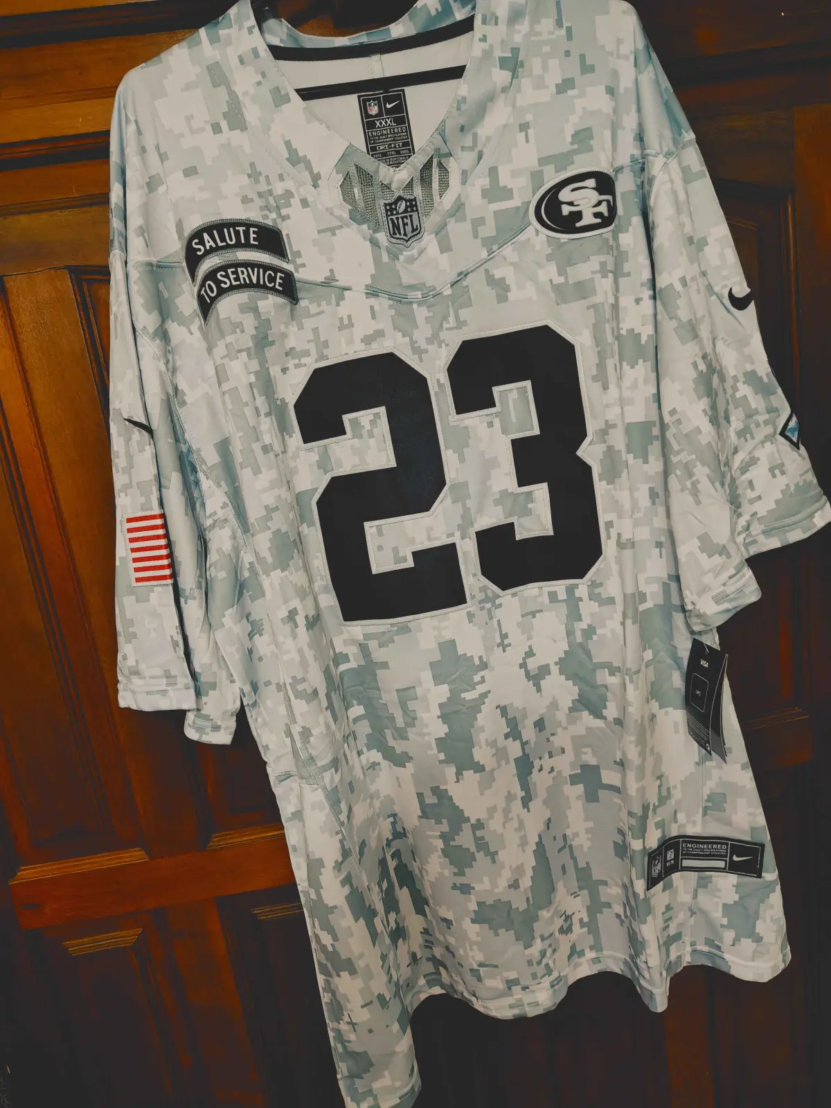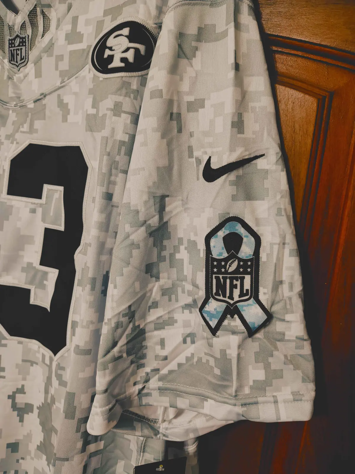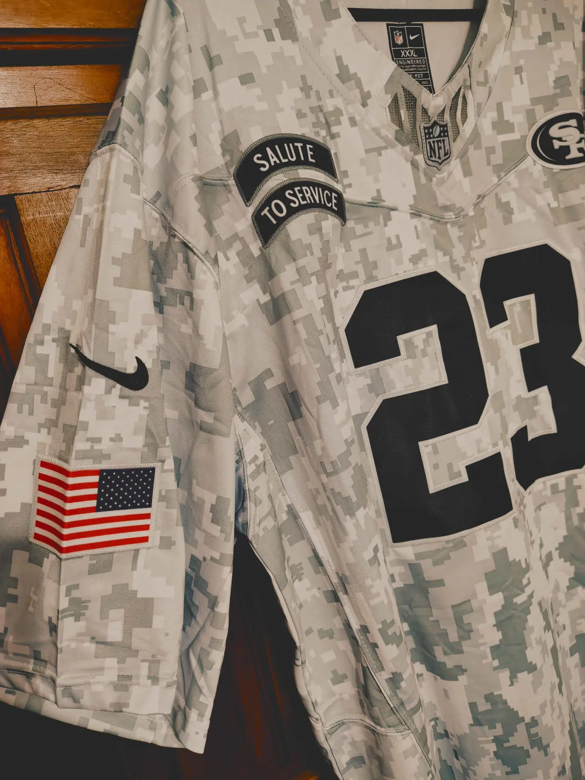 La camiseta de la imagen es una camiseta "Salute to Service" de los San Francisco 49ers de Christian McCaffrey con el número 23. Estas camisetas forman parte de una iniciativa benéfica anual de la NFL para honrar a los veteranos y miembros del servicio militar de Estados Unidos.