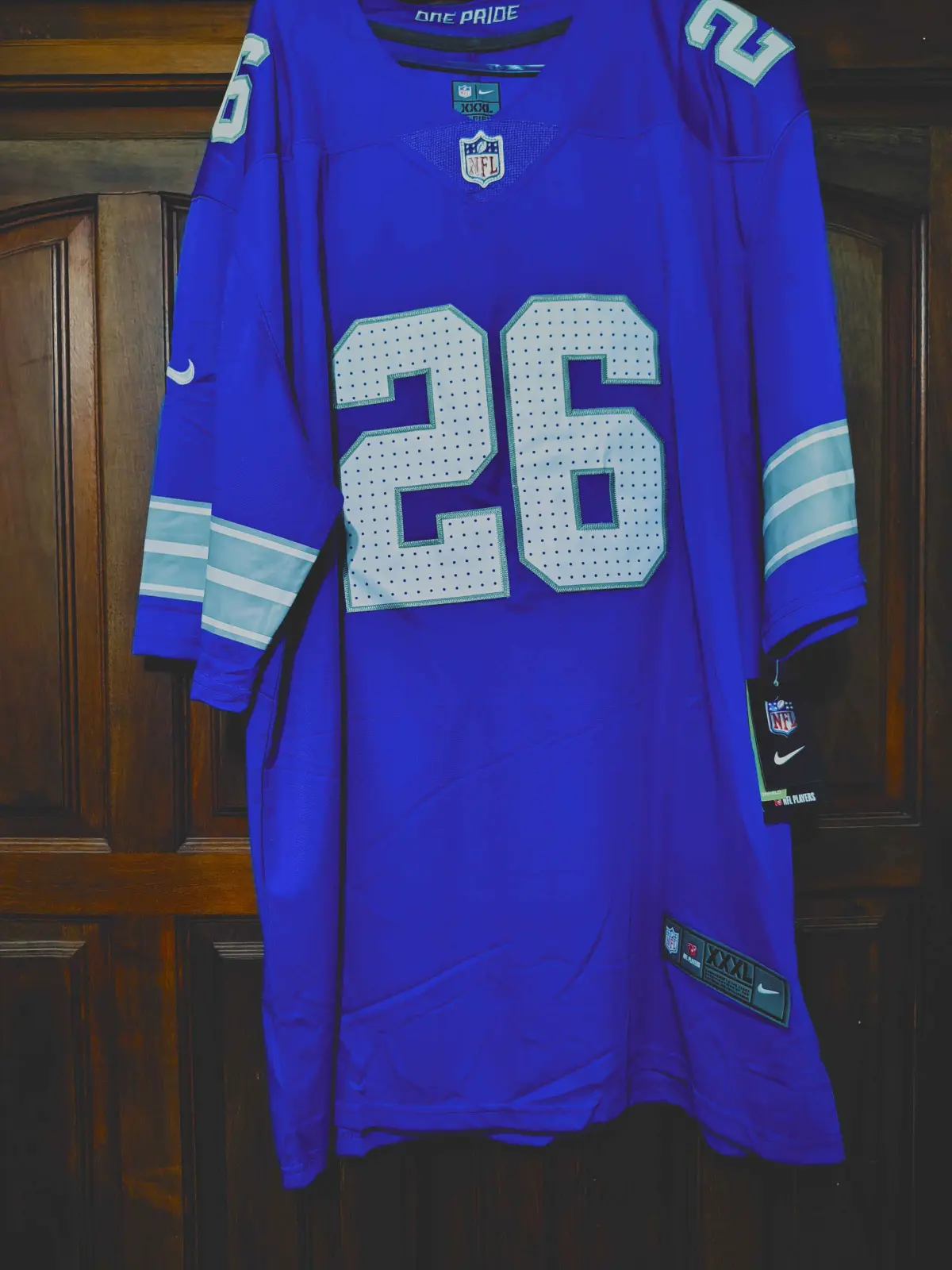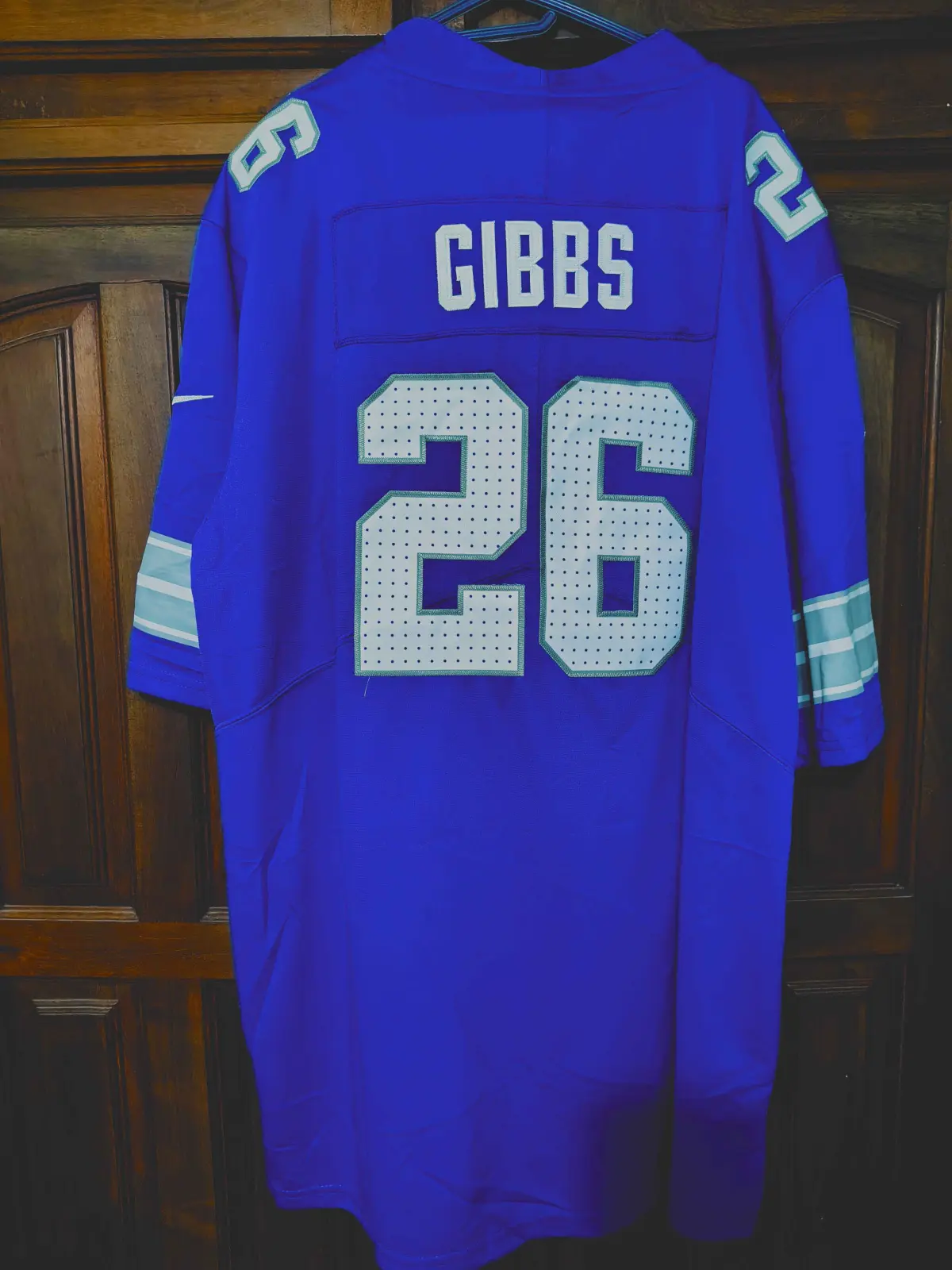 La camiseta de fútbol americano es una réplica Nike Game de los Detroit Lions de la NFL con el número 26, que originalmente perteneció al corredor Jahmyr Gibbs.