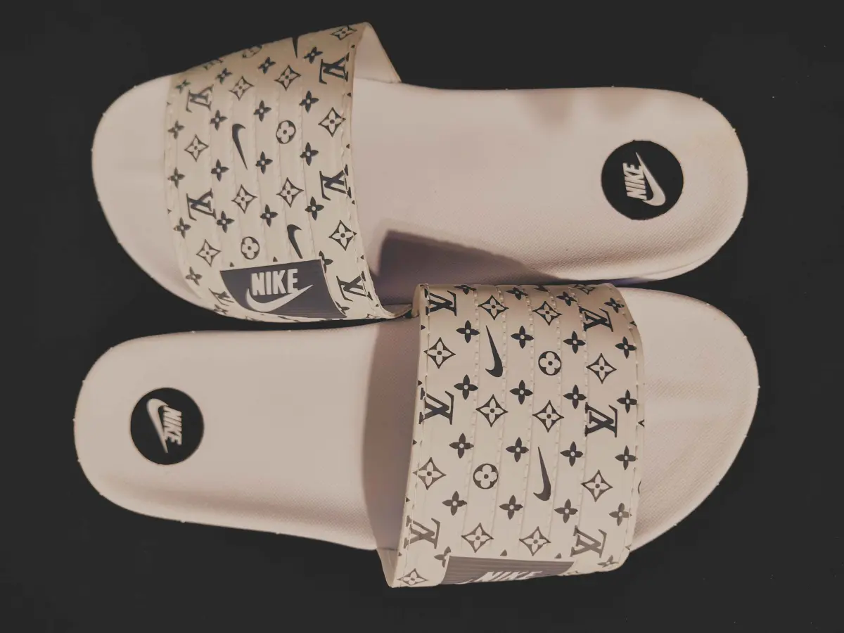 Las sandalias de la imagen son un artículo que combina elementos de diseño de Nike y Louis Vuitton, que probablemente son un producto personalizado o una réplica, ya que la colaboración oficial entre Nike y Louis Vuitton se limitó a las zapatillas Air Force 1.